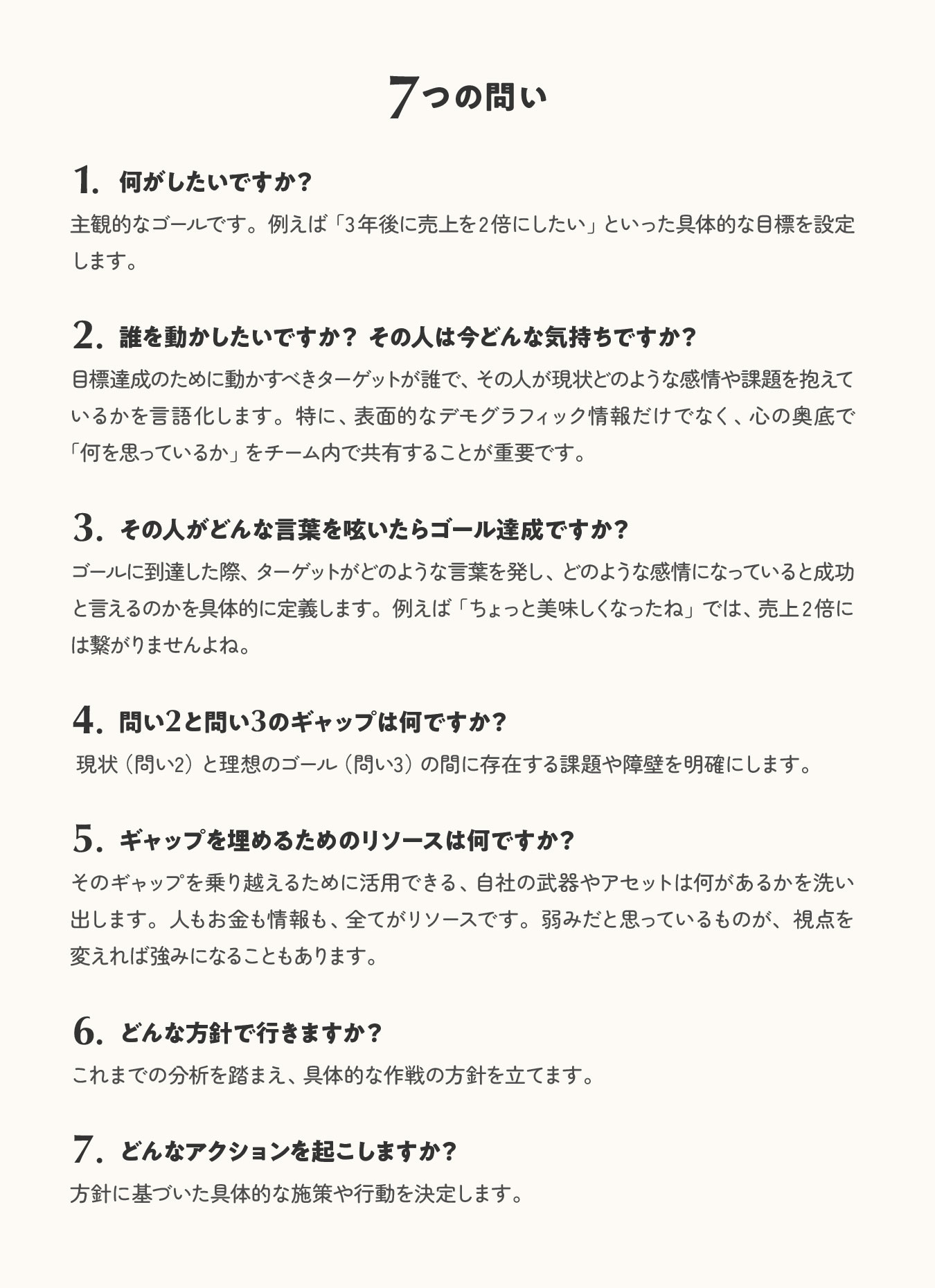 再現力を鍛える一つの手法が、デカルトの思想にもある「分解する」ことです。私は、どんな業種業界でも使える「7つの問い」というフレームワークを活用しています。これは、ブランド戦略を立てるための羅針盤となるものです。
